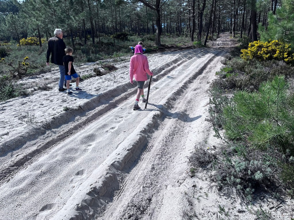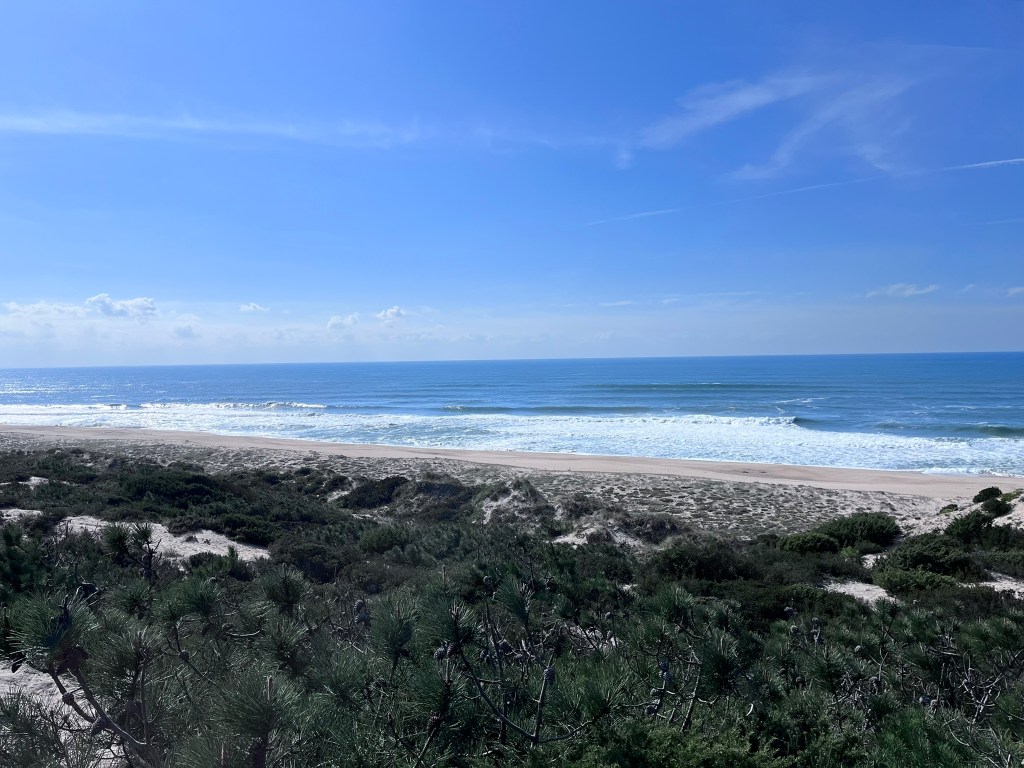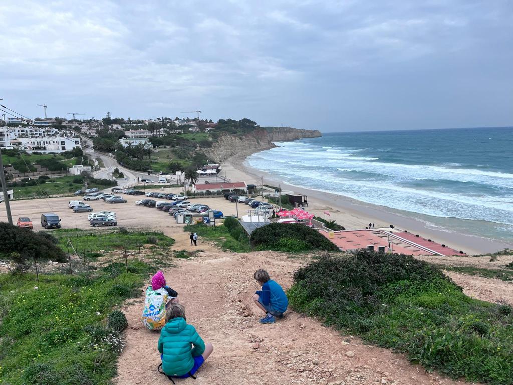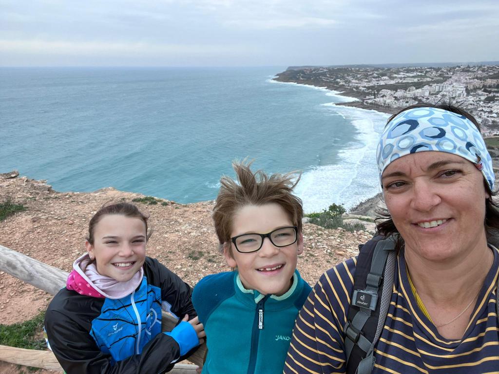 Dies ist die Aussicht von unserem Standplatz in Nazare Richtung Atlantik.Begleite uns nun auf unserem Weg zum Strand. Hier wurde kahlgeschlagen, um Papier herstellen zu können.Langsam nähern wir uns den Wäldern, die bereits aufgeforstet worden sind.Die Jungs finden unterwegs immer wieder neue, spannende Dinge.Wann wird wohl hier geerntet?Nun haben wir den Wald hinter uns. Das Meer liegt vor uns.Bald da. Nazare rühmt sich der höchsten Wellen Portugals. Es hat deshalb auch den Ruf eines Wellenreiter-Mekkas. Als wir dort waren, betrug die Wellenhöhe etwa 4 Meter.Das kann man sich hier auf den Bildern fast nicht vorstellen, doch es gibt eben Stellen, da drückt es das Wasser förmlich in die Höhe. Für die Kinder waren aber auch diese Brecher schon zu gefährlich.Und so sieht es nach der Welle aus.Langsam nähern wir uns der Steilküste. Das Klettern und kraxeln kann beginnen.Schnell gewinnen wir an Höhe.Und schon liegt der Leuchtturm von Nazare vor uns. Endlich geschafft! Nazare liegt unter uns. Der Strand ist reserviert für uns.Nun noch das Panorama von unten mit Strand. Das letzte Bild schoss Ursina vom Felsen links oben.Zum Abschluss das ganze noch aus anderer Perspektive. Der Strand war gesperrt, weil die Wellen zu hoch waren, doch auf den Fotos kann man das gar nicht einfangen. Schade, aber unsere Eindrücke werden bleiben.