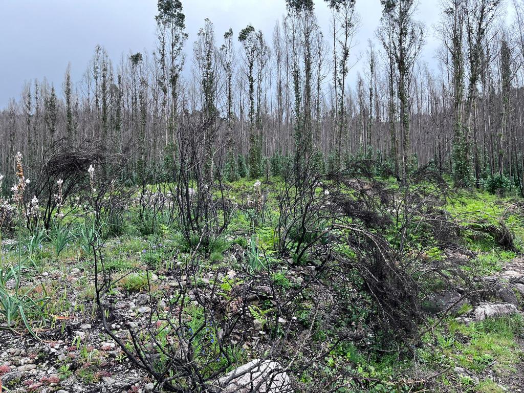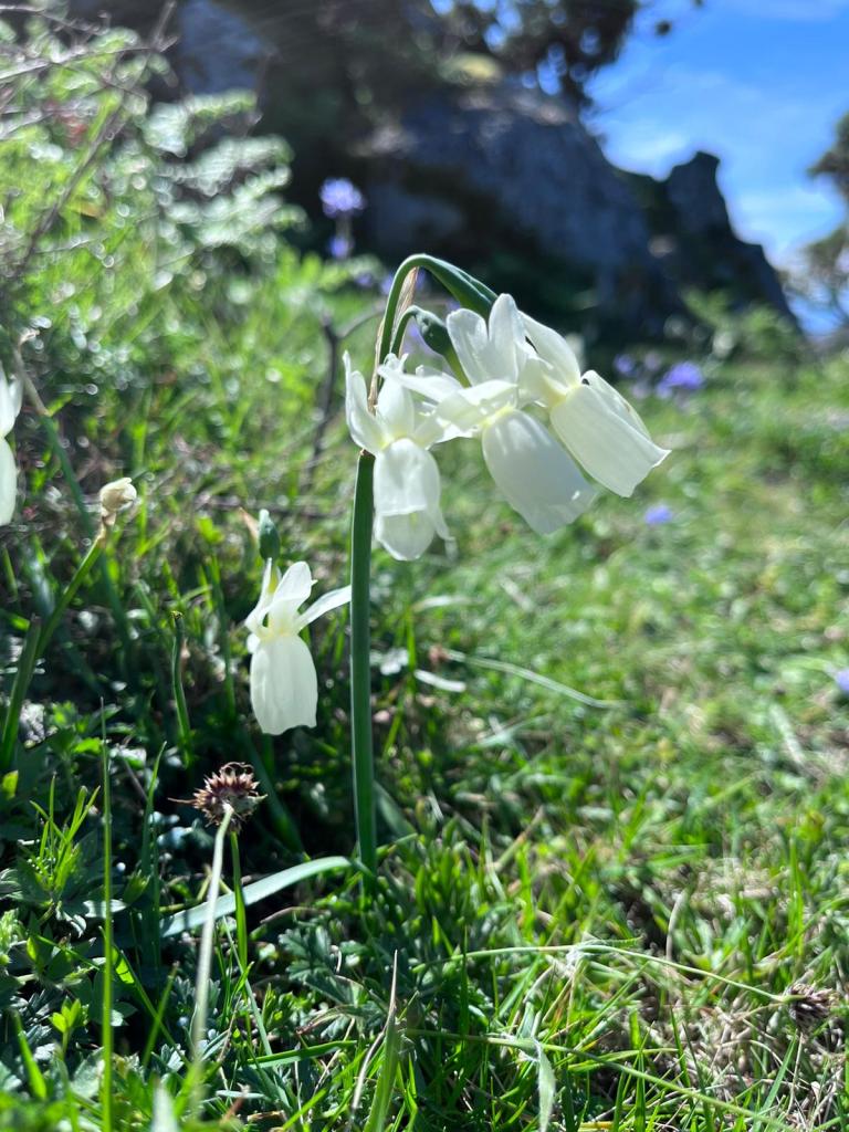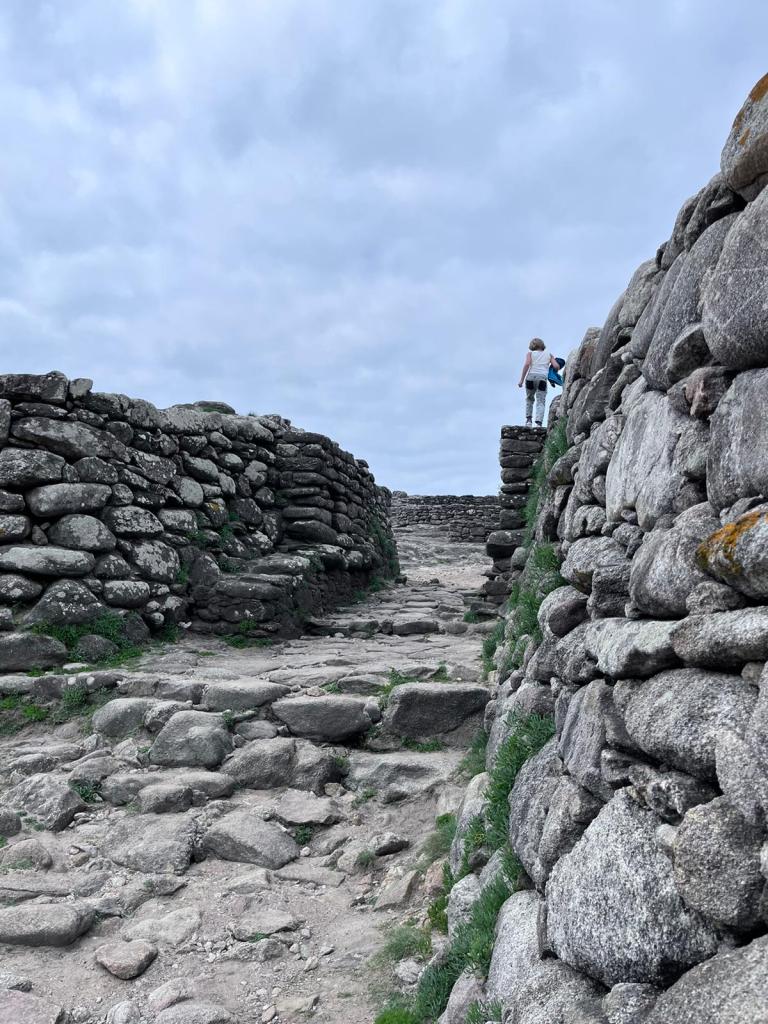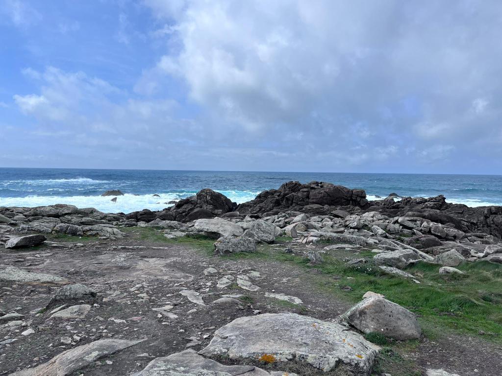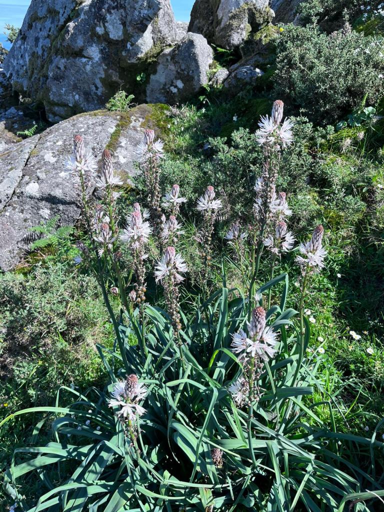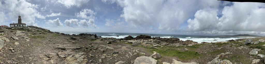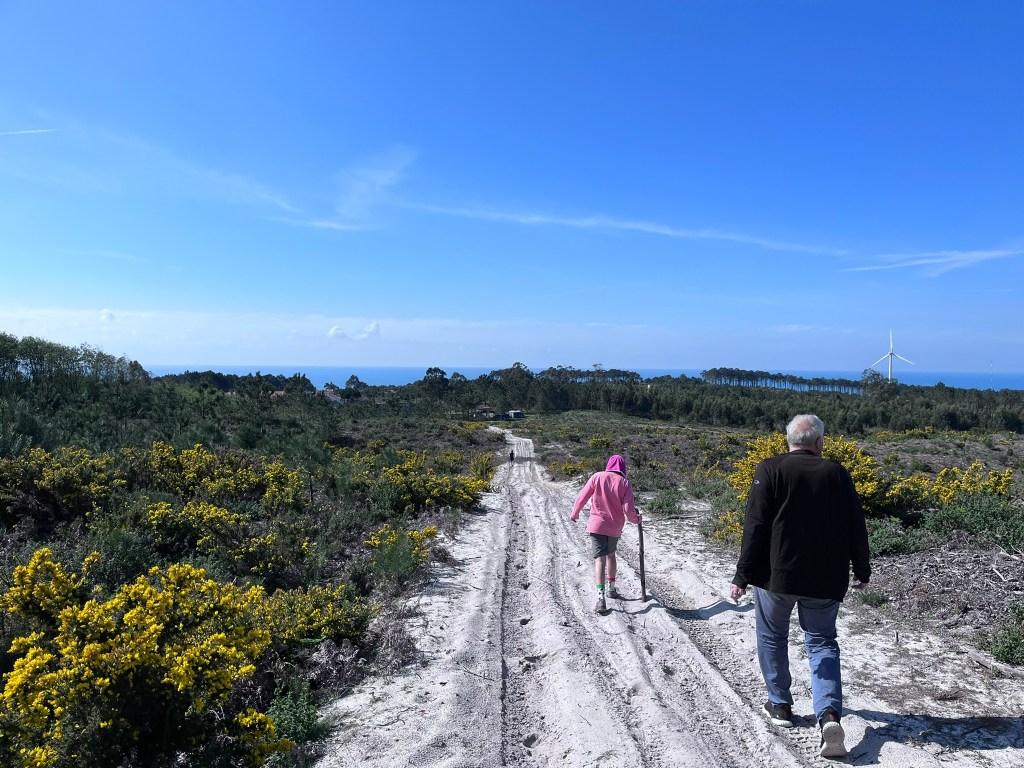 Eine erste Wanderung führt uns hinter den Platz. Hier brannte 2022 der Wald komplett nieder. Der Platz konnte gehalten werden. Die blauen Eukalyptusbäume schlagen alle wieder aus.Es geht ziemlich weglos obsi. Der Wasserfall im Hintergrund weist uns auf unser Ziel.Ein kleiner Fischteich befindet sich oberhalb. Sehr idyllisch.Die Jungs sind sofort begeistert.Zwei Tage danach besuchen wir den Leuchtturm von Corrubedo.Sicher war so manches Schiff froh um das rettende Leuchtfeuer.Und inmitten rauer Wildnis blüht ein Sandkrokus.Und sonst ist es sehr karg.Ein weiterer Ausflug führt uns zum Castro de Barona. Hinter diesen Felsen, landeinwärts haben sich vor 2200 Jahren Kelten niedergelassenVon den einstigen Rundhäusern sind noch die Grundmauern zu sehen.In den Gassen des Dorfes kann man gut spielen und klettern.Jari zieht es einmal mehr hoch hinaus.Beeindruckt verlassen wir die Siedlung.Auf unserem Platz geniessen wir immer wieder das Bad im 30 Meter langen Pool. Er steht uns meist exklusiv zur Verfügung.Einfach schön und erfrischend.Auch am Strand sind wir noch hin und wieder anzutreffen. Hier in A Pobra do Caraminal.Eine weitere Wanderung führt uns dem Rio Artes entlang. Ein richtig schöner zweistündiger Spaziergang.Direkt neben dem Camping bauen sich die Kinder und Ursina ihren eigenen Badeteich.Man beachte das kristallklare Wasser.Eine Spezialität der Gegend sind die Kornspeicher.Ganz in unserer Nähe erhebt sich der Mirador de Curota 500 Meter steil aus dem Meer. Die Aussicht ist überwältigend, doch möchte ich mich zum Schluss des Berichtes auf einige Spezialitäten des Berges konzentrieren.So leben hier Wildpferde.Überall blüht der Kaiseraffodill.Etwas seltener gedeiht die Engelstränen-Narzisse.Die Wassermelone allerdings findet man auf dem Markt von Noia.Ein idyllisches Städtchen, das wir bereits zweimal besucht haben. Ach ja, uns gefällt es in Galizien so gut, dass wir wohl noch ein paar Tage länger dableiben.