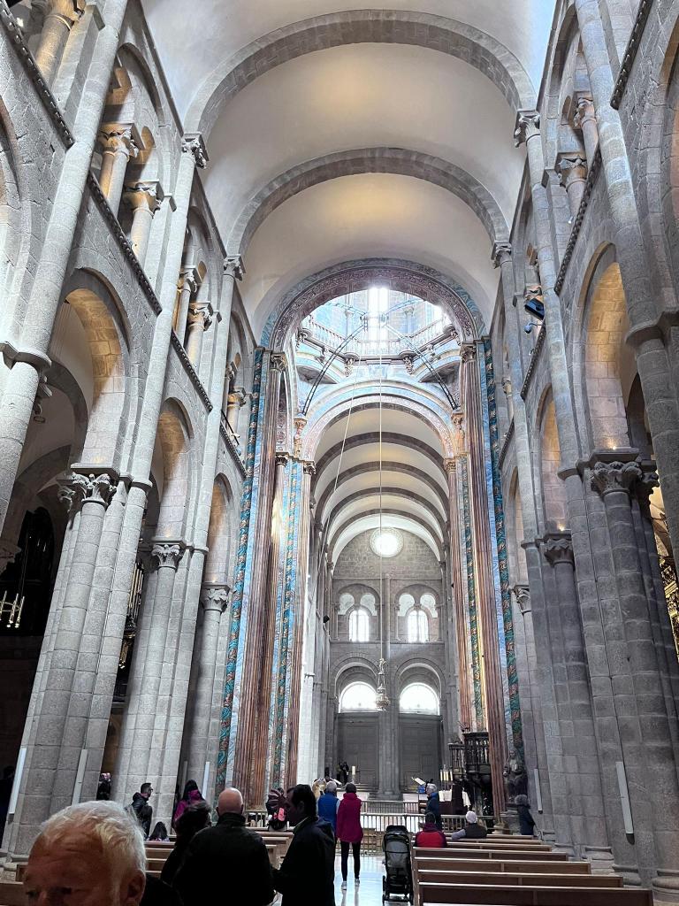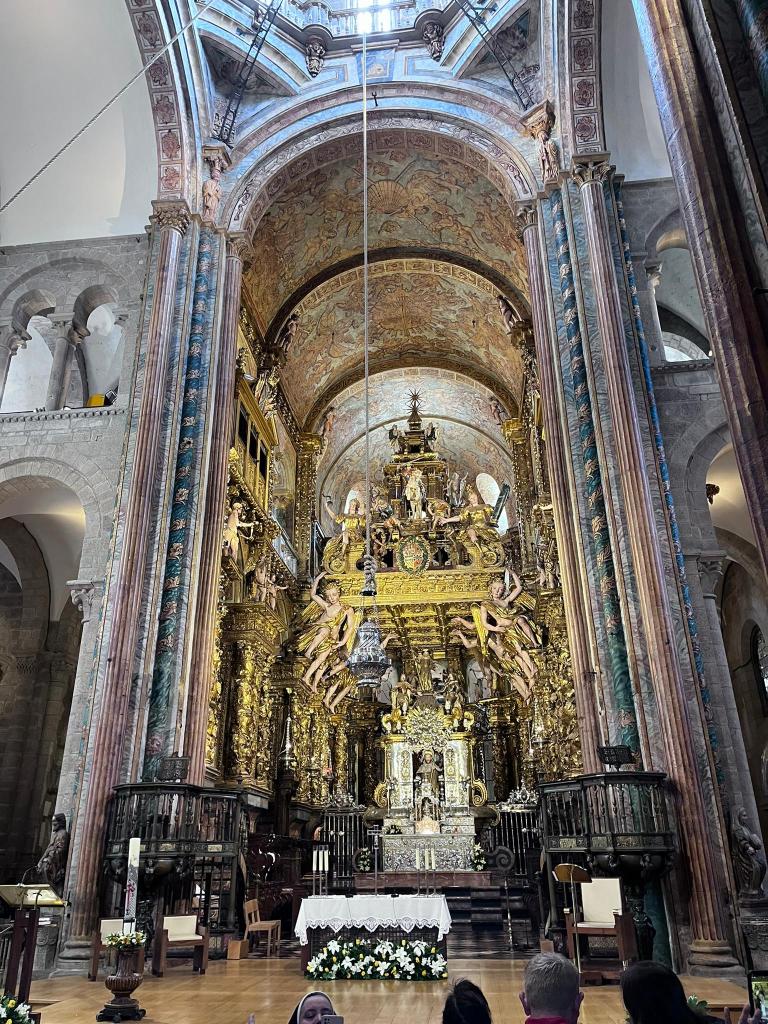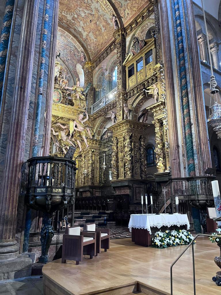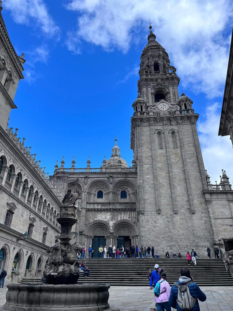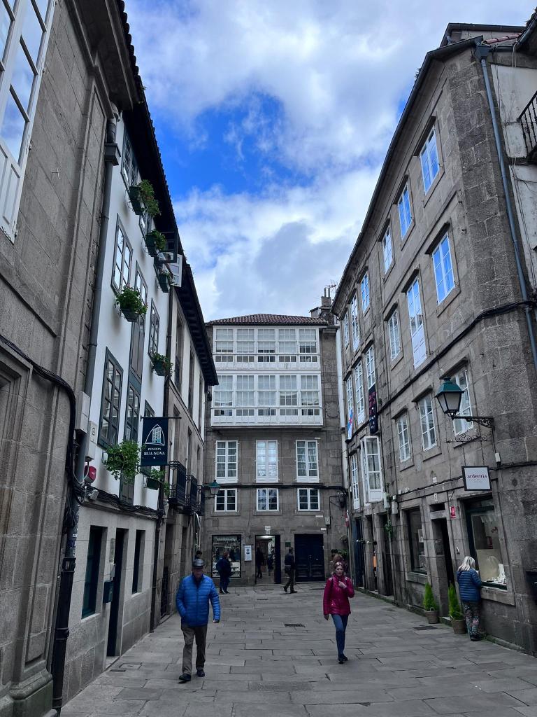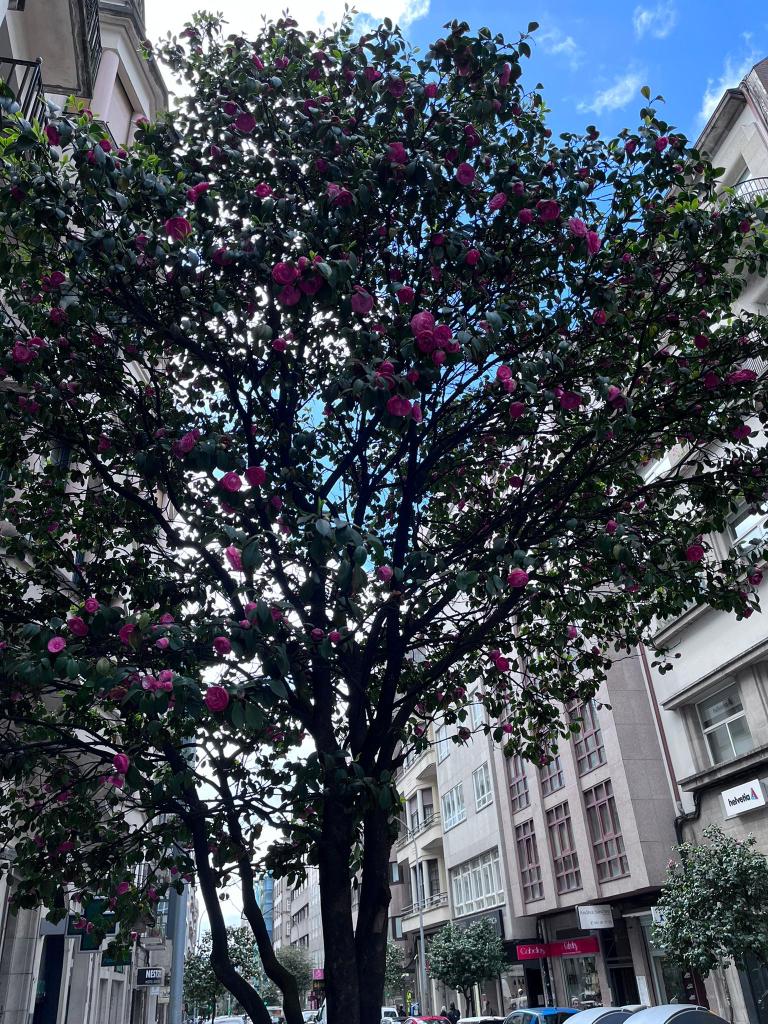 Ohne zu pilgern haben wir Santiago de Compostela gefunden. Parkplatz am Bahnhof, weshalb wir hier mit unserer Tour starten. So gibt es heute also nur die Eindrücke eines einzigen Tages.Zuerst sind die Strassen noch breit und arg befahren.Aber schon bald sind wir in der Altstadt. Enge Gassen_ ein Déjà vue.Uuups, wo geht es weiter?Natürlich finden wir den Weg und auch die üblichen Ramschverkäufer fehlen nicht.Wir kommen unserem Tagesziel immer näher, doch auch die Regenwolken haben uns entdeckt.Doch sobald wir die Kathedrale erreicht haben, bessert auch das WetterZuerst geht’s aussen rum.Klostermauern, die die Welt draussen hielten.Grosse Plätze, zu dieser Jahreszeit noch recht leer.Und endlich betreten wir die heiligen Hallen. Was vom Eingang her noch recht schlicht wirkt, ändert sich bald.Der Prunk des Hauptaltars ist überwältigend.Die Orgel, das heisst eigentlich nur eine Hälfte. Der Rest ist gleich gross vis à vis.Altar, seitlich.Etwas schlichter die Seitenaltäre.Schlicht und doch eindrücklich, was nicht zuletzt dem Boden zu verdanken ist.Super, gell!Ein Blick in die Gruft des heiligen Jakobus des Älteren.Bevor wir die Kirche verlassen zieht uns dieses Fenster in Bann.Und auch dieses Deckenteil hat uns fasziniert.Am Anfang wieder am Ende, beim Eingang.Den Weg zurück säumten unzählige Kamelien. Deshalb schliesse ich heute mit diesen blühenden Bäumen. Zuerst in hellroisa.Eine dunklere Variante.Unschuldig rein die Weissen.Den Schlusspunkt setzen heute aber diese Rosen und Glyzinien. Für uns geht es zurück nach Oleiros. Gas müssen wir eben auch noch besorgen. Es ist Frühling, geniessen wir ihn.